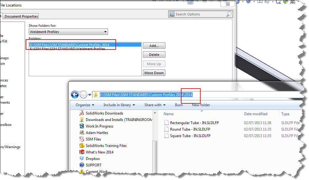 As mentioned the folder structure has to be a little different for these- basically they need to be located one less folder deep. In the SOLIDWORKS Options File Locations - Weldment Profiles, the linked folder in the past needed to have two subfolders nested beneath (in 2013)- the Standard and the Type, in this Type folder would be all of the separate documents for each profile. For these configuration based profiles, you only need one sub folder for the Standard- the file residing in that folder represents the Type and then the configuration represents the size. All a little confusing, so hopefully this image captures it all!!