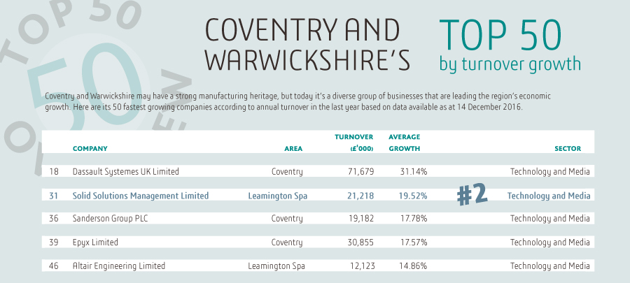 BDO's Growth Barometer recognises the top 50 fastest growing companies in the region. Solid Solutions is delighted to be placed within the top 50 growing companies according to annual turnover in the last year, and even more so to be 2nd in our sector.