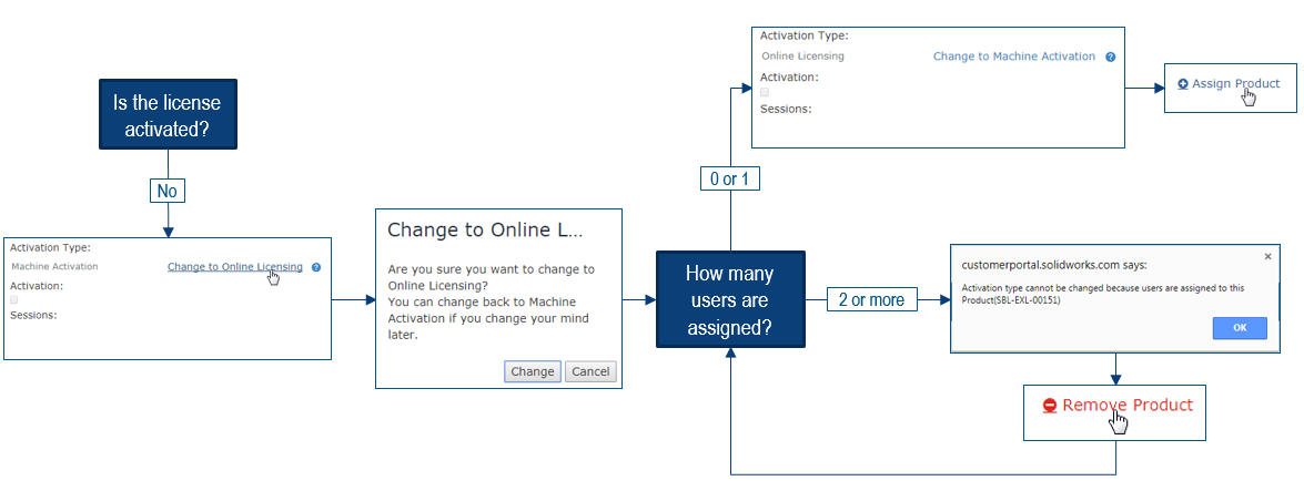 • To convert a SOLIDWORKS license to an Online Licensed product, it must be assigned to a user in the Admin Portal and have its current machine based activation deactivated.