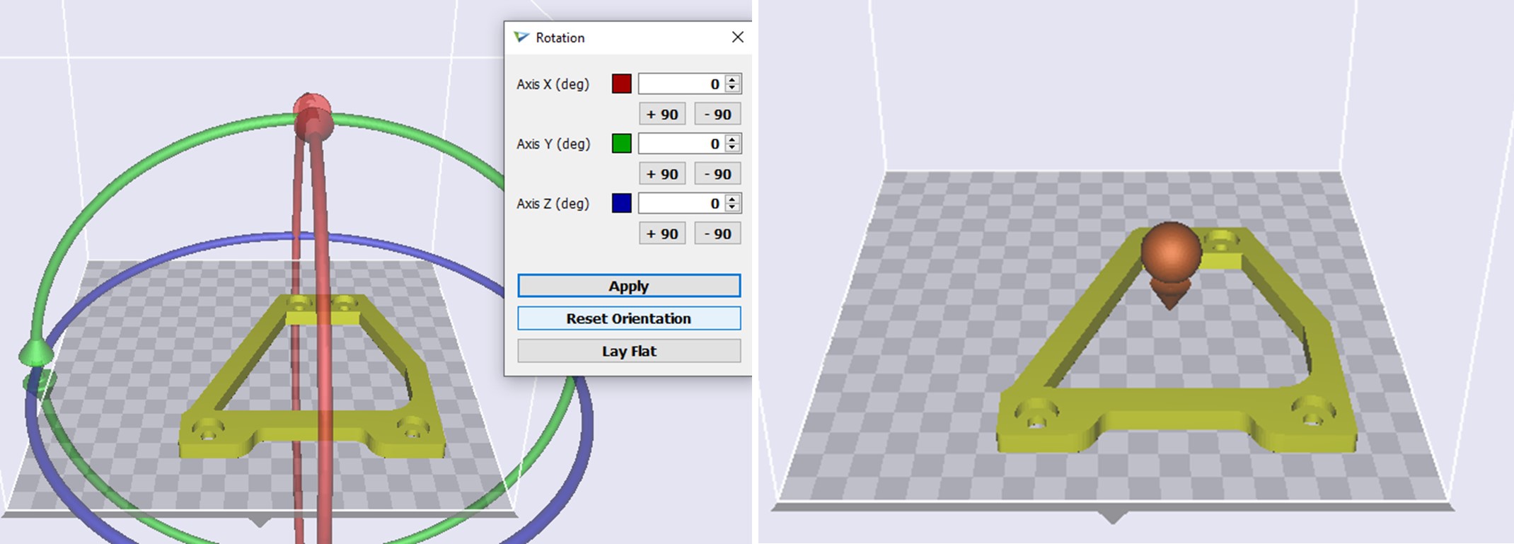 It is important to think about which face you want attached to the build plate. Often this face will have a reduced quality surface finish. Plus, thinner features attached to the build plate may require a brim or a raft to prevent thermal warpage. By considering orientation, it may also be possible to reduce the number of overhangs in the part.