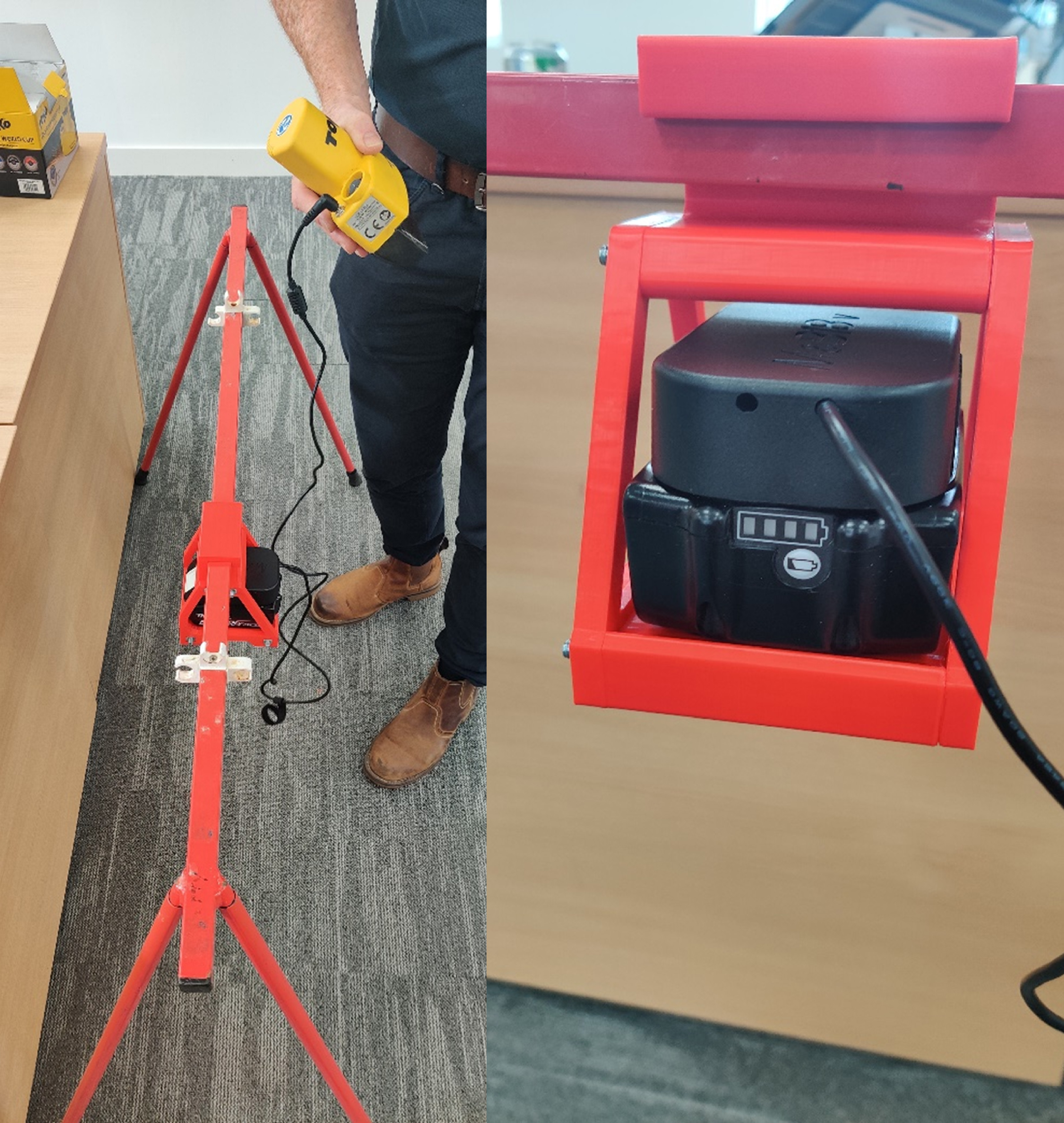 Jon challenged me to provide him with a solution. 3D printing allows a quick permanent fix for this problem - by designing a shelf that the drill battery and adapter can sit on, and attach to the ski clamp frame, the battery will be raised off the ground allowing greater use of the 1m wire available.