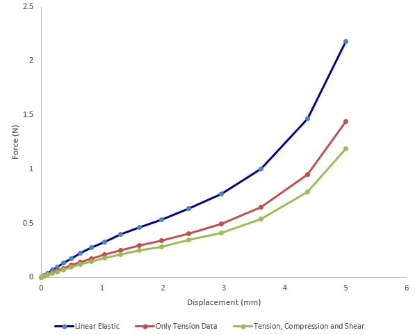 Comparing the force vs displacement behaviour for the rigid plate used to compress the part we can see the contrast in behaviour. The linear model is 80% stiffer than the best model using three sets of test data. The intermediate solution based on just tensile data is 20% stiffer.