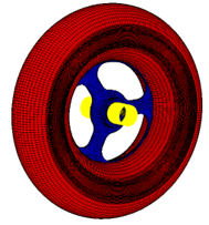 This technique is not limited to wheels and tyres. It’s been used for all sorts of applications where the assembly of the critical non-linear component, such as a seal, can be represented axi-symetrically. Further capability in Marc allows the mapping of 2D-3D displacement/strain fields to model shell to brick mapping: